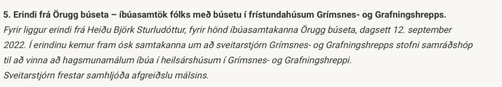 Fyrir hönd stjórnar Öruggrar búsetu. Íbúasamtaka fólks með búsetu í frístundahúsum Grímsnes – og Grafningshrepps. Heiða Björk Sturludóttir